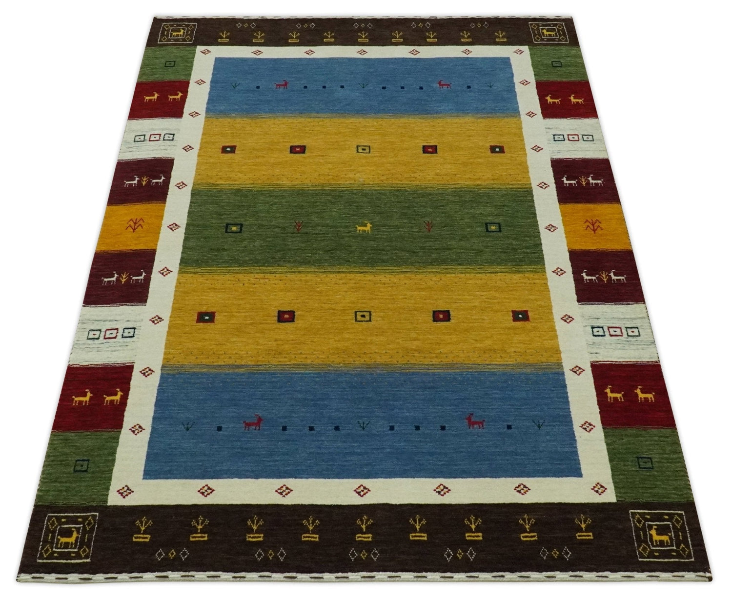 Tribal Gabbeh Green, Gold, Blue, Maroon and Ivory Stripes Design Traditional Hand loom 4.6x6.6 Wool Area Rug