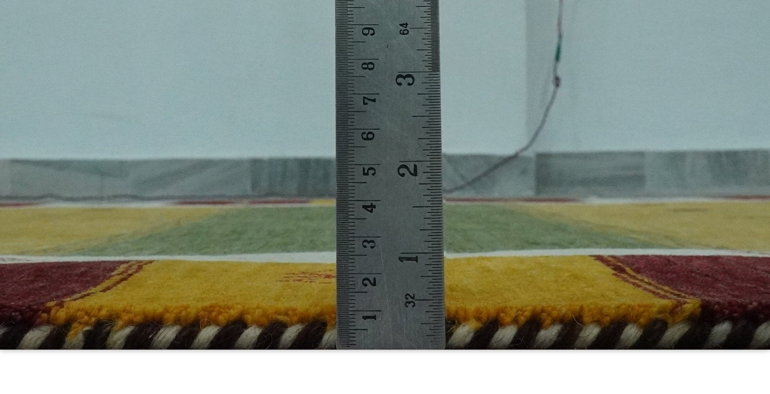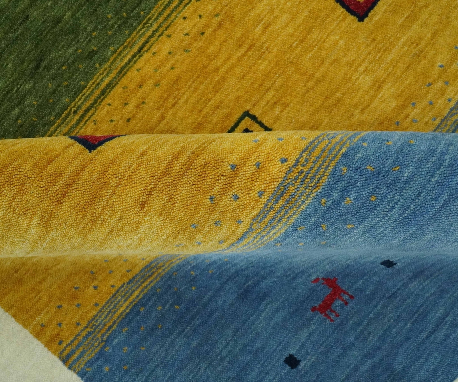 Tribal Gabbeh Green, Gold, Blue, Maroon and Ivory Stripes Design Traditional Hand loom 4.6x6.6 Wool Area Rug - 4.6x6.6 is backordered and will ship as soon as it is back in stock.