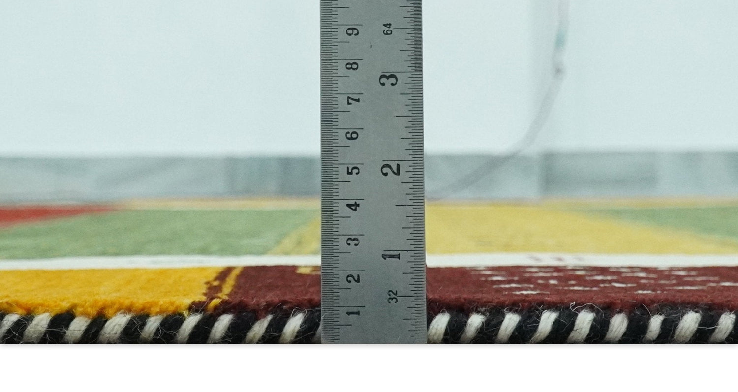 Tribal Gabbeh Green, Gold, Ivory, Maroon and Black Stripes design Traditional Hand loom 4.6x7 Wool Area Rug - 4.6x7 is backordered and will ship as soon as it is back in stock.