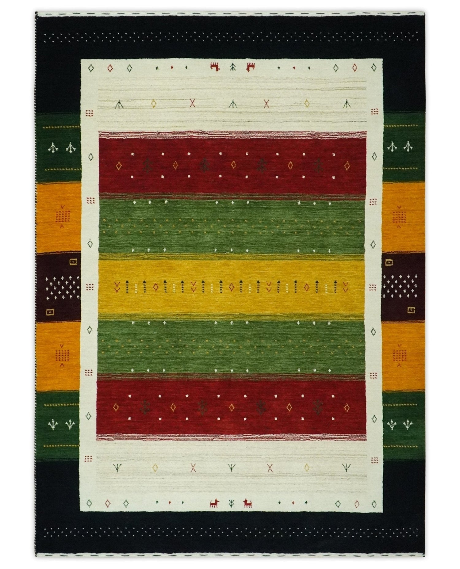 Tribal Gabbeh Green, Gold, Ivory, Maroon and Black Stripes design Traditional Hand loom 4.6x7 Wool Area Rug