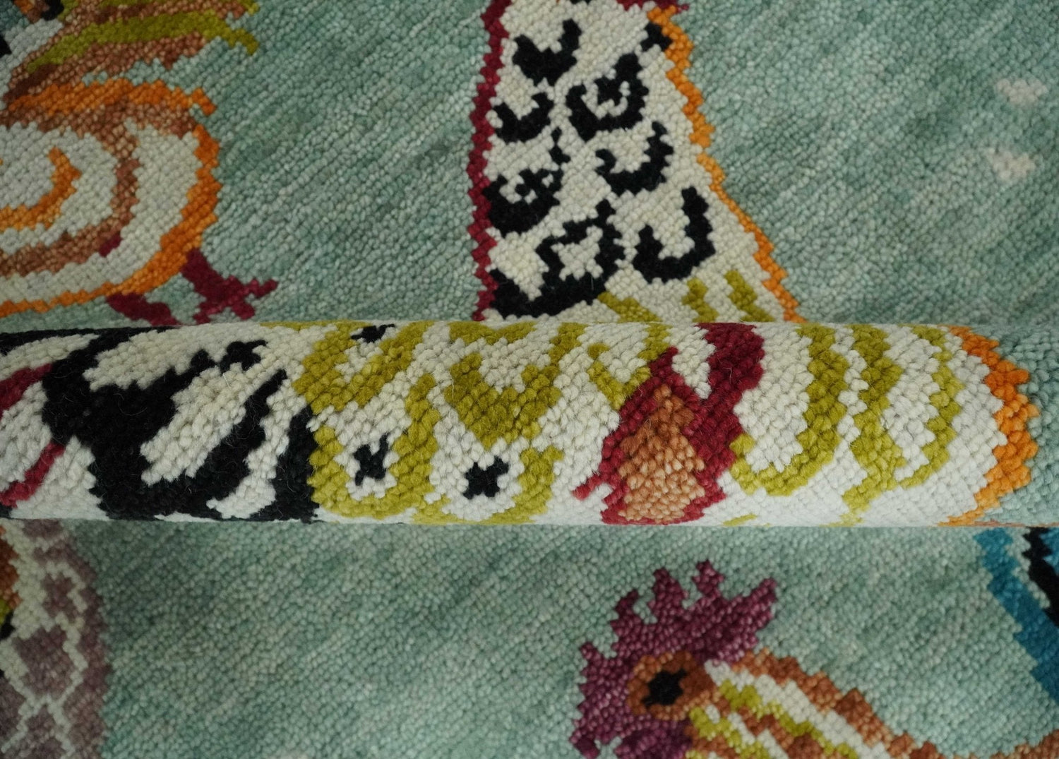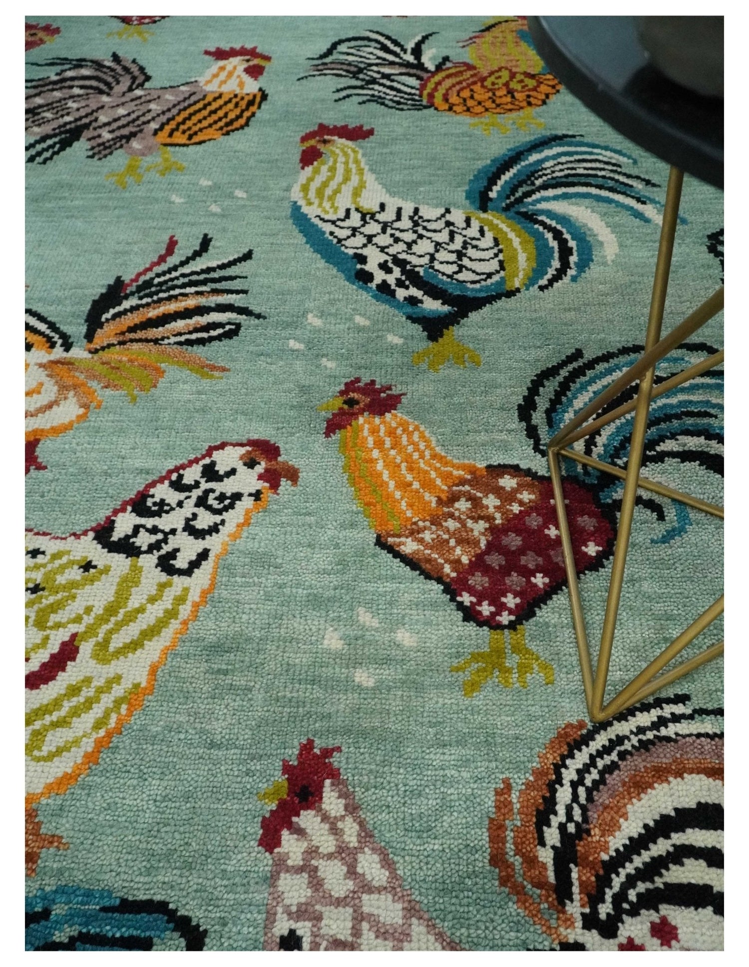 Vibrant Colorful Beautiful chicken Light Green, Ivory, Gold and Brown Hand Knotted 8x10 Wool Area Rug