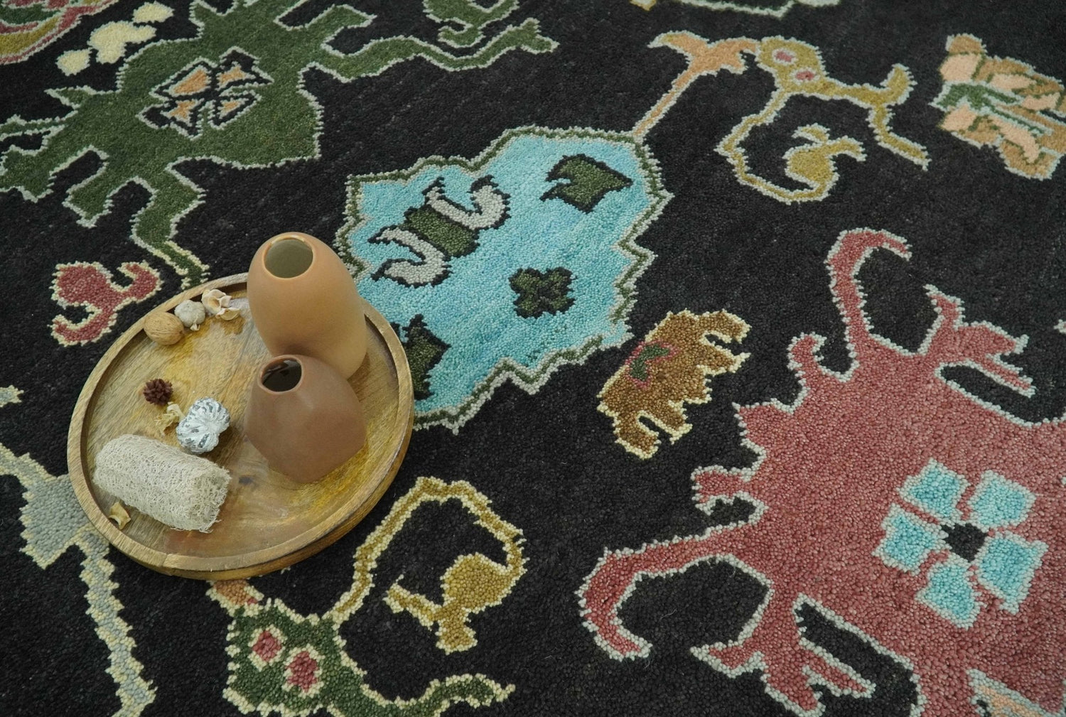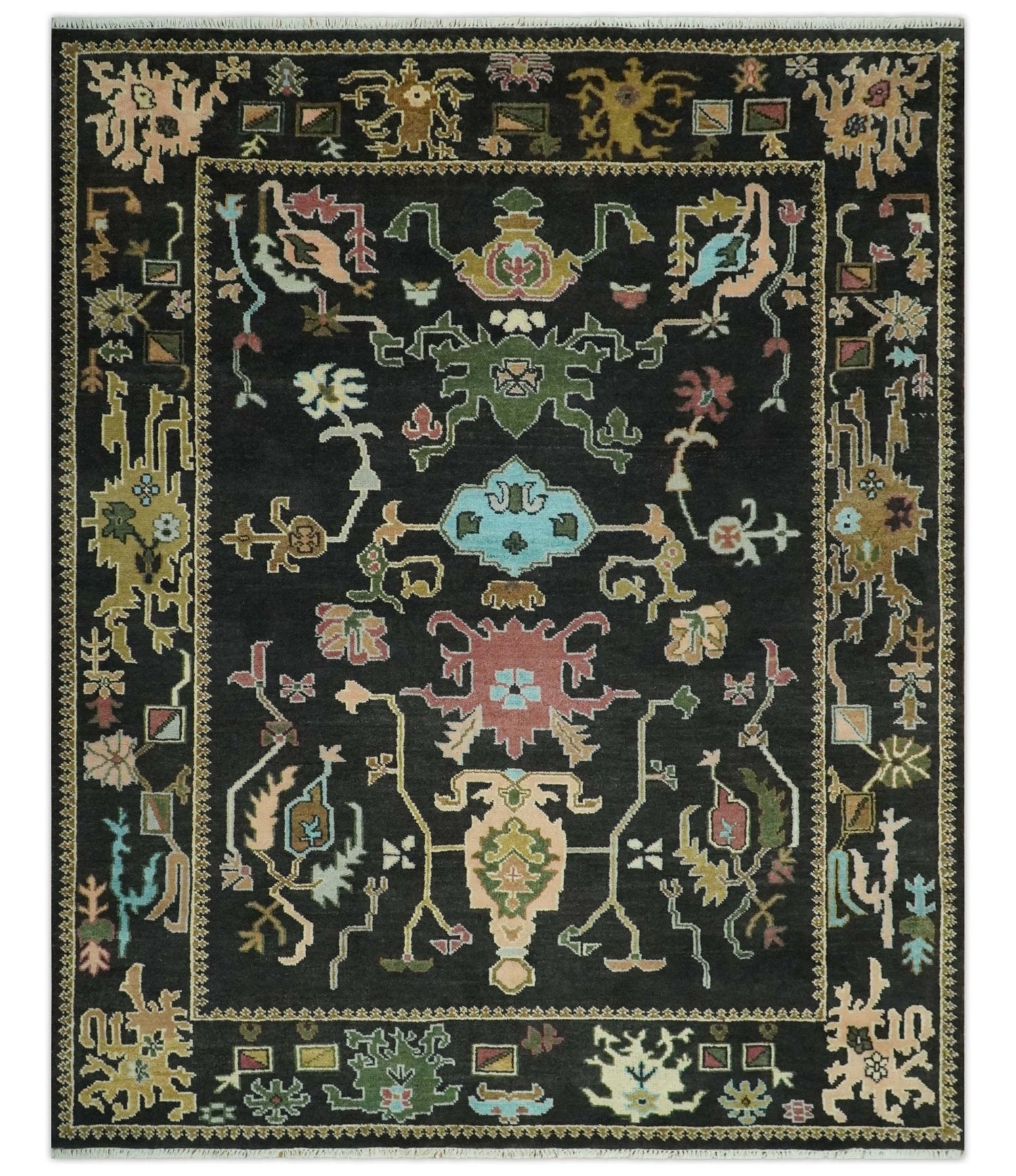Vibrant Colorful Black 8x10 Hand Knotted Traditional Oushak wool area rug