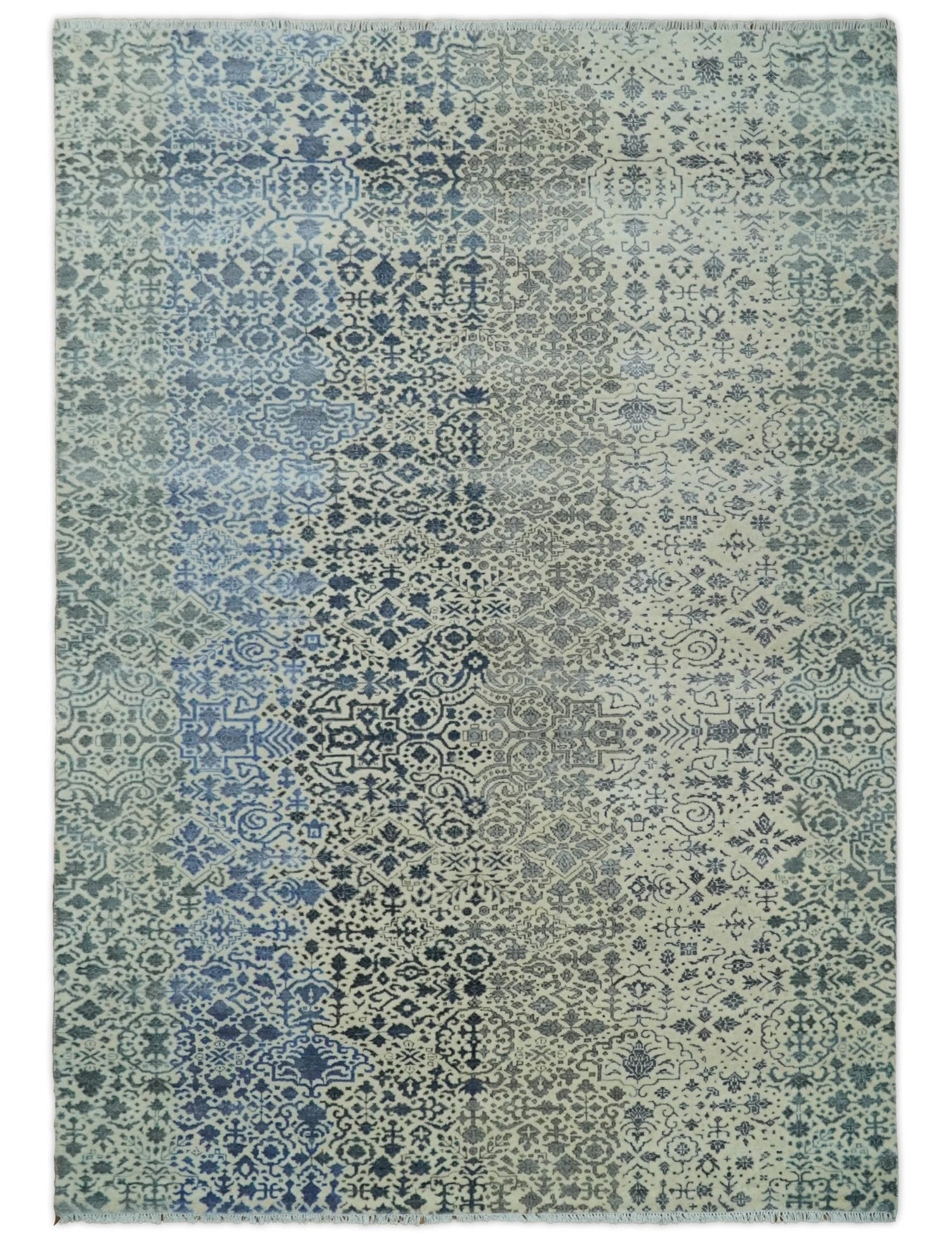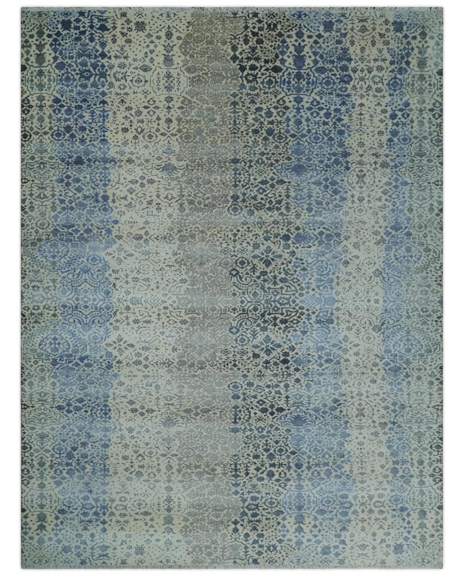 Woolen Modern Contemporray Wool Beige, Blue and Silver Hand knotted Rug